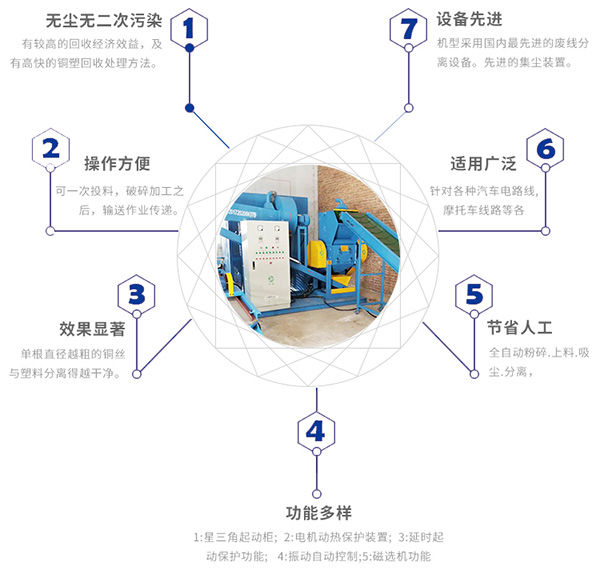 全自动铜米机主要用于处理废旧杂电线、毛细铜线、家用电器线、硬平方线、照明用软电线等多种废线的回收处理设备,把线里面的金属与塑料的分离分选出来。全自动铜米机又称1000大型铜米机,不但可以处理大批量的电线电缆,还可以针对不同要求进行生产线配置。
