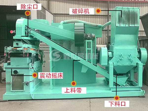 整个粉铜米机器是一台破碎、分选一体的机器,它由破碎机、分选机、双层循环槽、配电箱等部分组成。